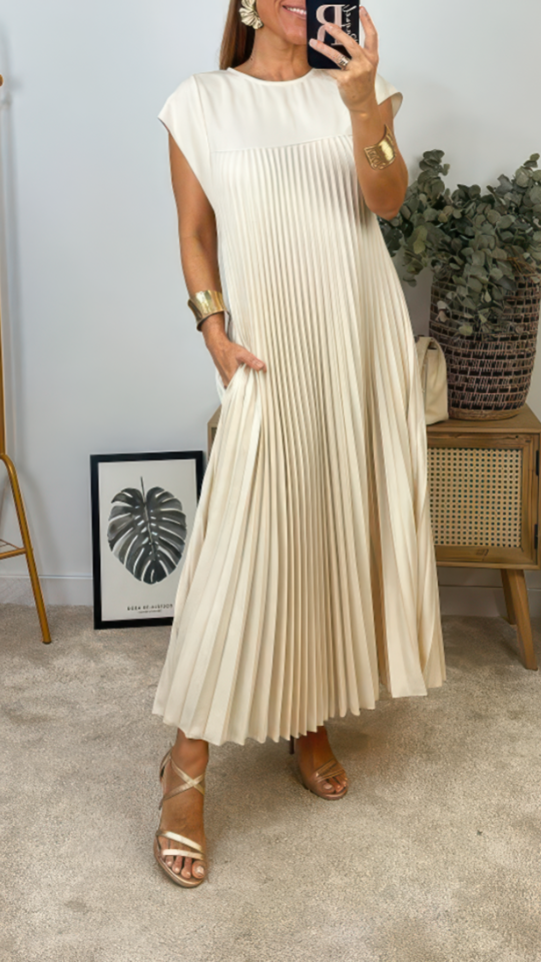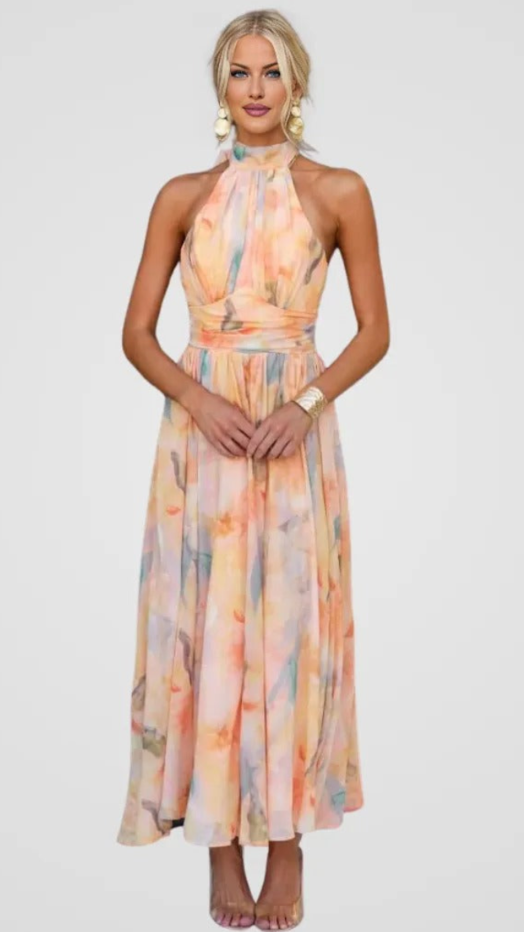 De Peachy™ dress straalt pure zomerse romantiek uit. Met zijn zachte aquarelprint in warme perziktinten en de elegante halternek is het de ideale metgezel voor zonnige dagen en zwoele avonden. De vloeiende stof valt soepel om je figuur, terwijl de geaccentueerde taille een prachtig vrouwelijke si...