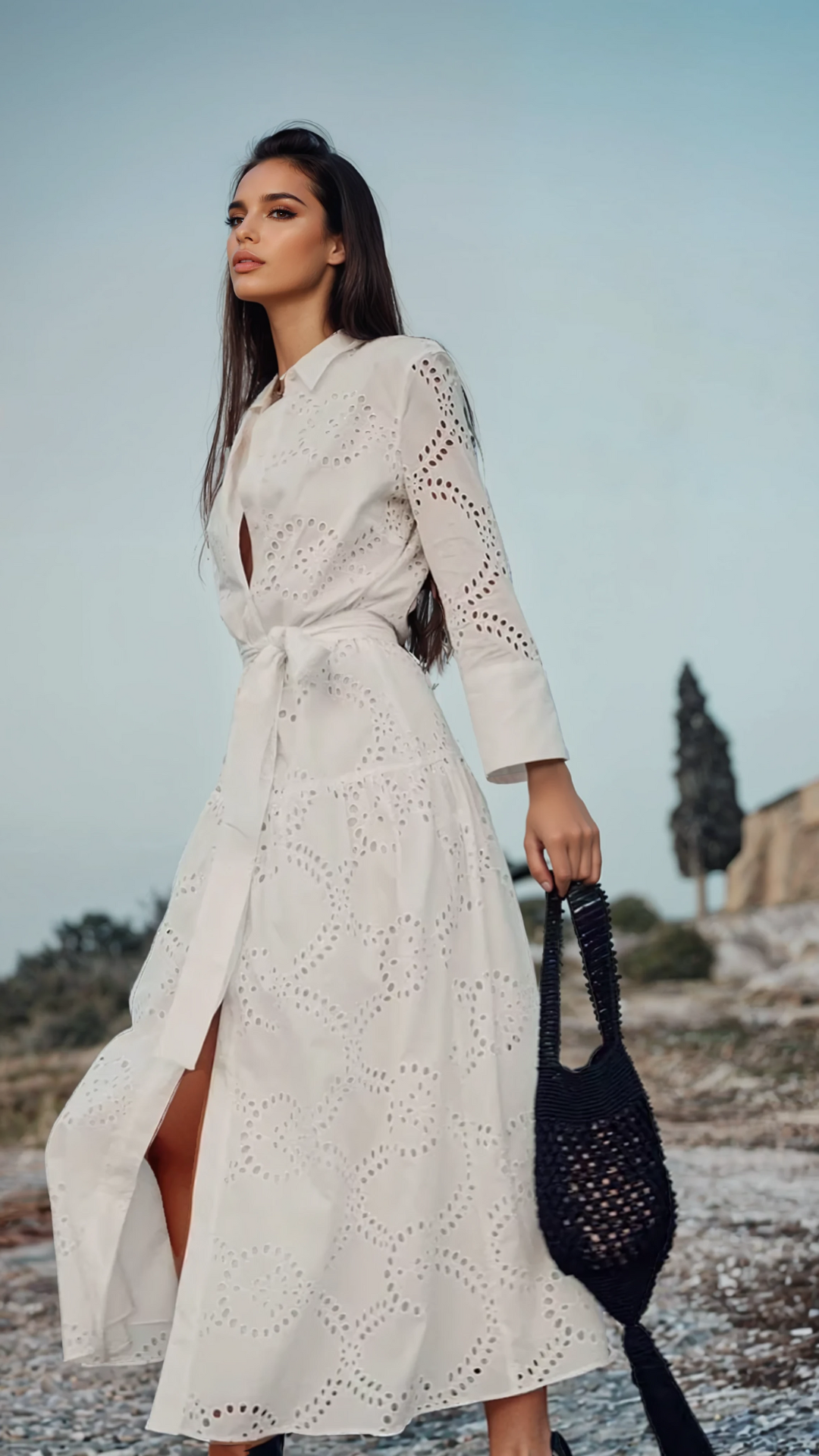 Een stralende elegantie die met de seizoenen meereist. Lana™ belichaamt de perfecte balans tussen structuur en verfijning. Haar verlengde overhemdsnit, geaccentueerd met een strikceintuur, creëert een vloeiend en zelfverzekerd silhouet. De opengewerkte borduursels laten het licht door op een zach...