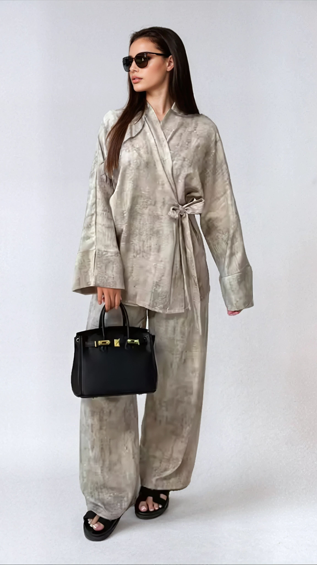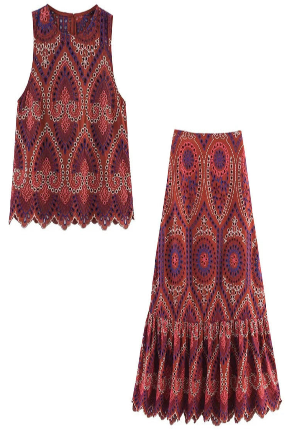De basistinten zijn een mix van zacht roze, beige, bruin en steenrood, met een etnisch-geïnspireerd patroon. De kleuren zijn perfect gebalanceerd: warm en aards, maar met een vrouwelijke zachte uitstraling. De print is zorgvuldig verdeeld waardoor het geheel luxe oogt.